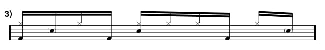 Let’s take a look at #1! Start by playing 5 eighth notes on the hi hat, then add a snare on beat 3 and another right in between counts 4 and 5. Once you’re comfortable with that, add in the kick drums!