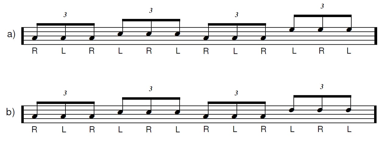 The exercise is played using triplets and will again help increase your speed and movement around the drum-set. Most drummers are very good at playing groups of four around the kit and always leading each of those groupings with their dominant hand. Well, that’s going to change right now. When you move from drum to drum you’ll be changing the lead hand. I know it looks easy, but it’s not when you push it faster and faster!